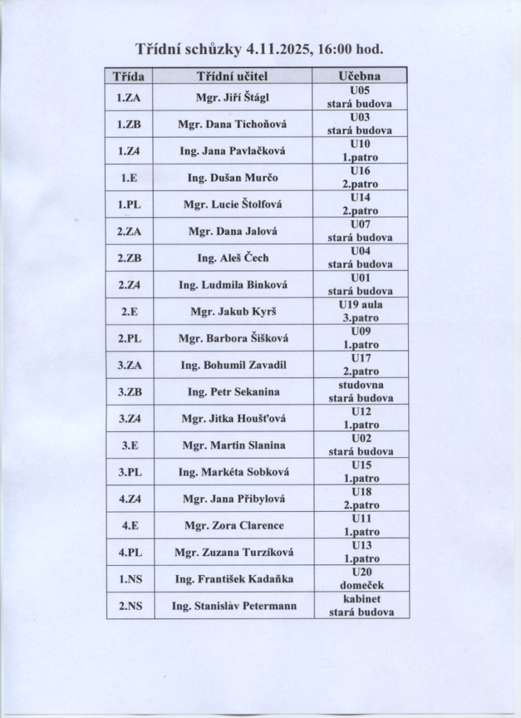 Níže v tabulce je rozpis učeben na zítřejší třídní schůzky.